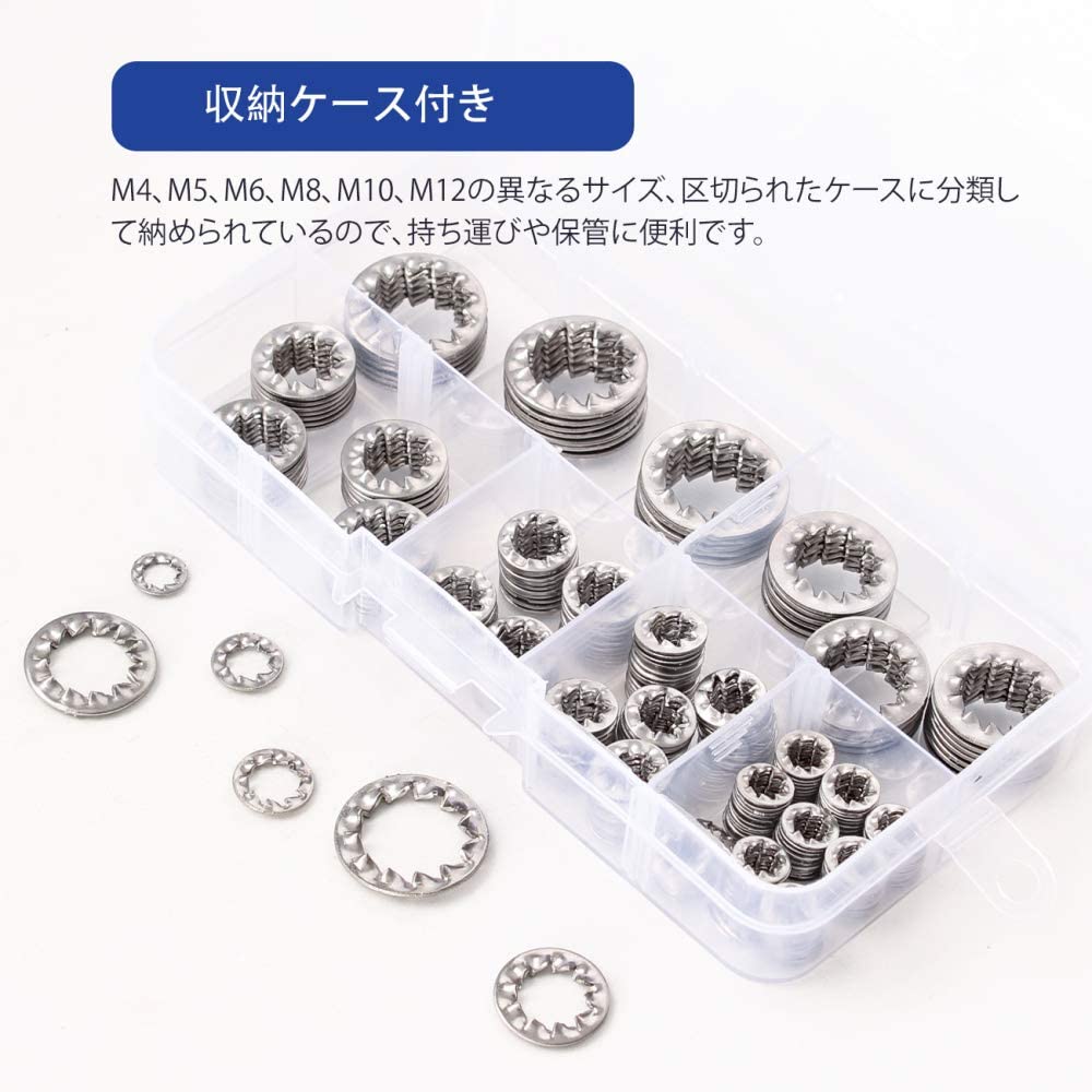 「サイズ」M4x100個、M5x60個、M6x40個、M8x30個、M10x20個、M12x20個歯付座金はサイズが多く、ニーズに合わせて使用してください。