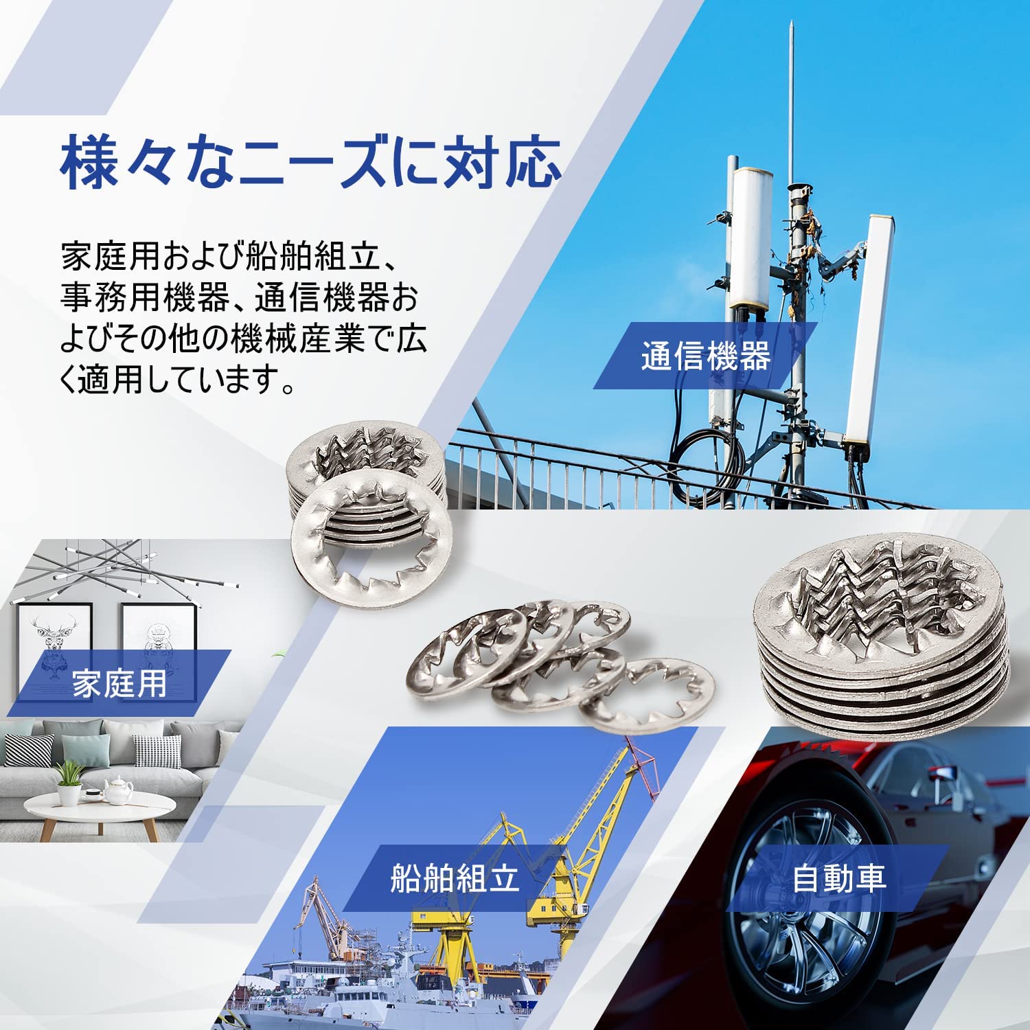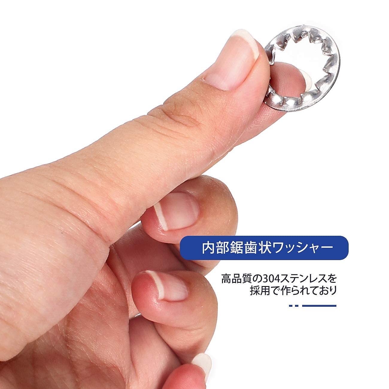 「材質」この内部鋸歯状ワッシャーは高品質の304ステンレスを採用で作られており、防錆性があり、多くの環境で伸びと耐食性の良い強度を持っています。