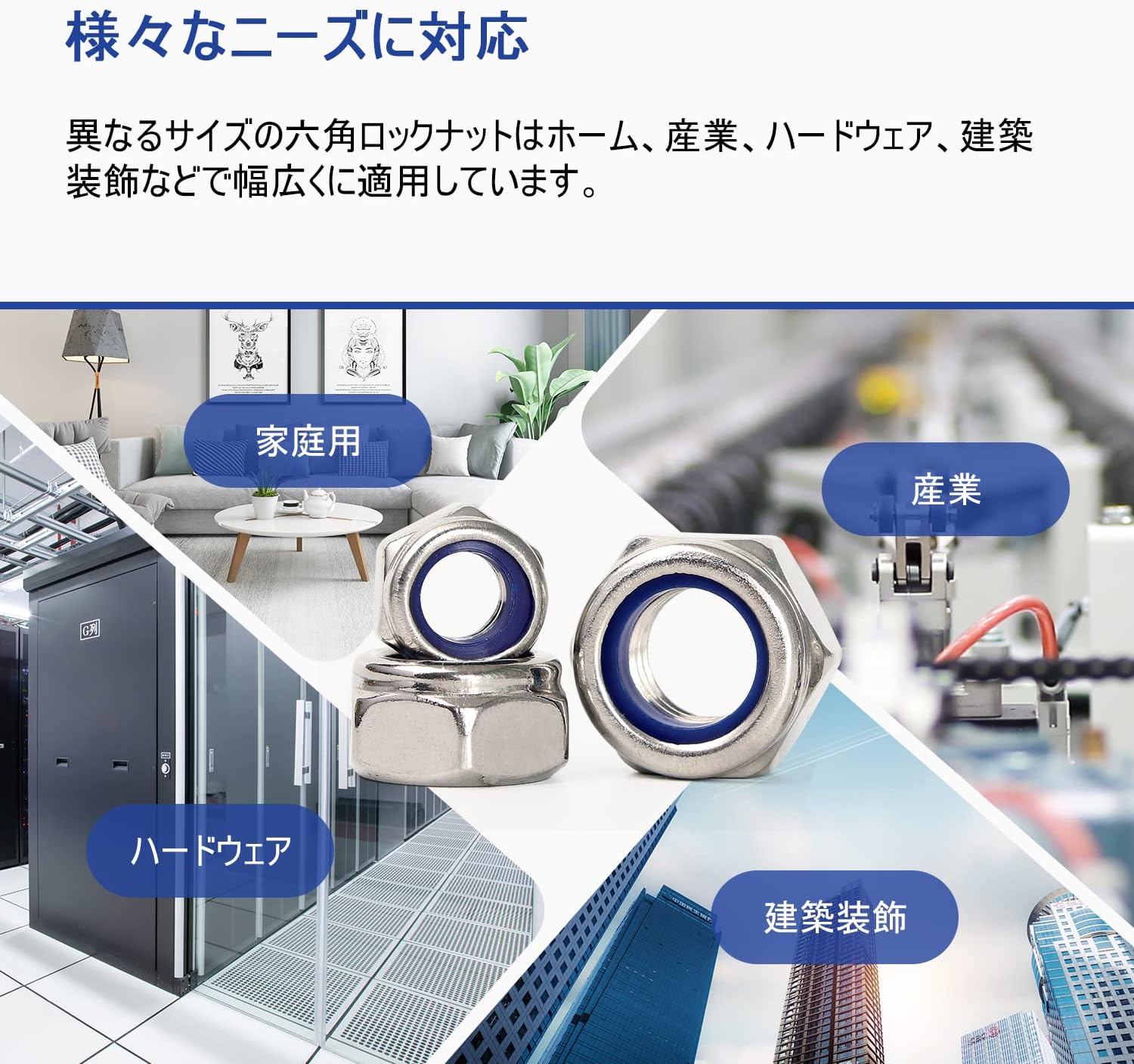 「利点」ナイロン製のインサートで、振動やトルクによって緩みを大幅に軽減することができます。”